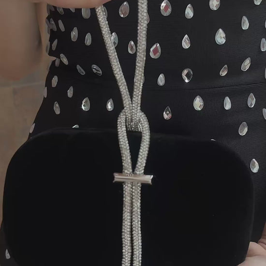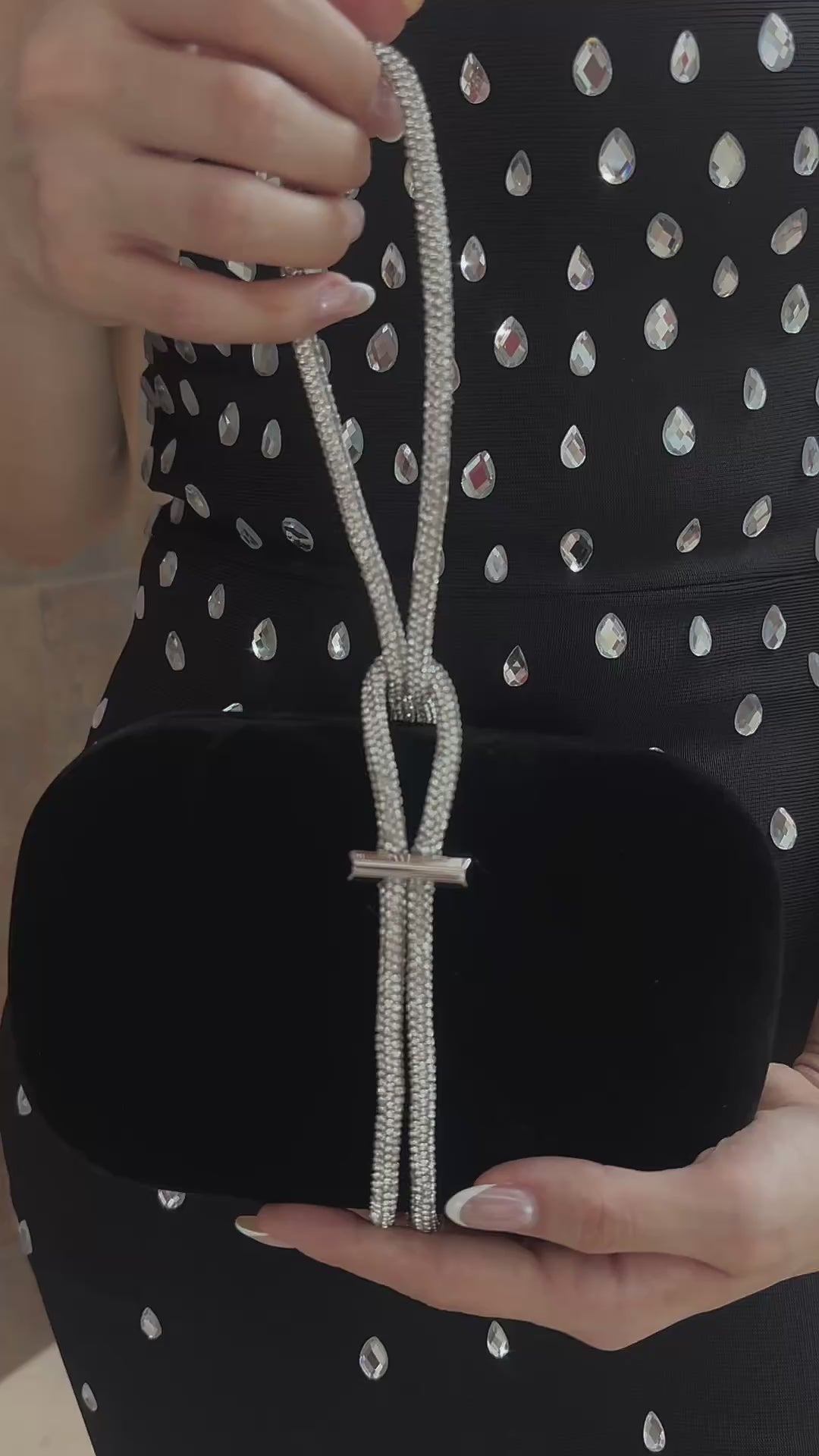 Black clutch aterciopelado en tono negro con detalle de listón en piedras