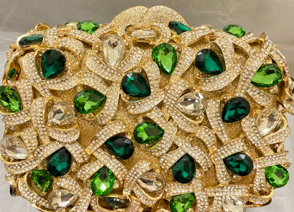 Bolso de mano verde/dorado con diamantes de imitación para dama.