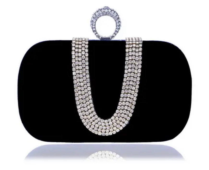 Bolso tipo clutch, ideal para un evento de formal. Con material de gamuza y un detalle de piedras con destellos plateados.