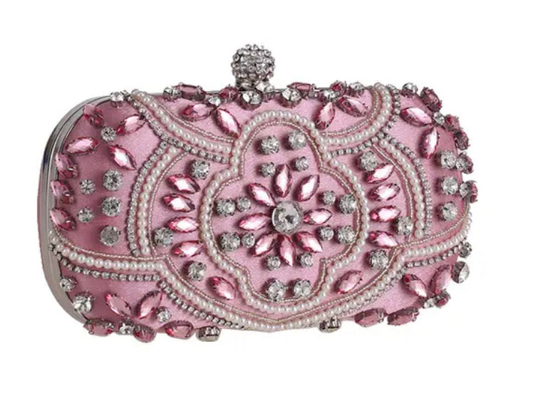 Clutch de mano con piedras grandes y pequeñas color base rosa y plata.