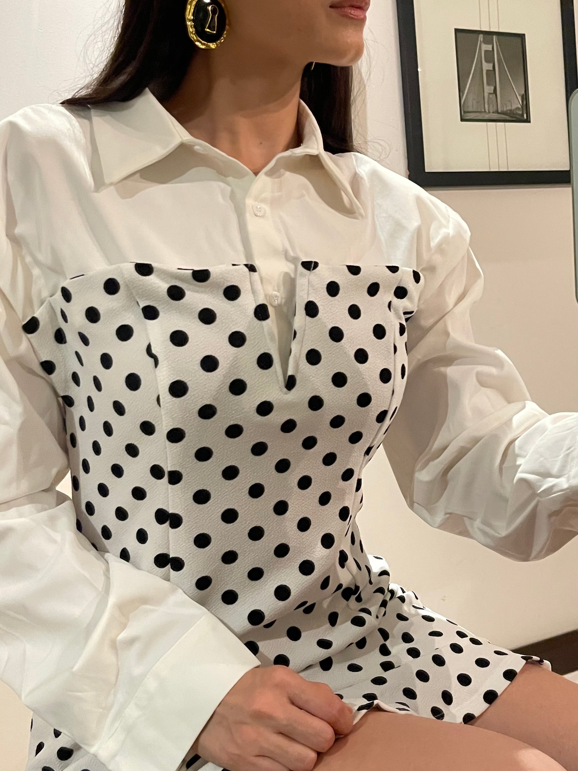 Vestido corto de lunares blanco y negro con under T-shirt y detalle globo